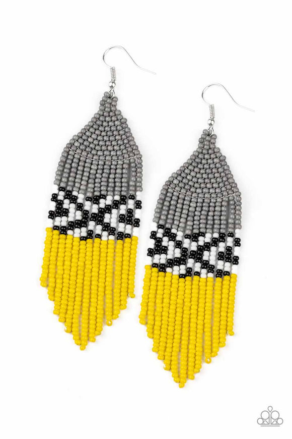 Strands of gray, black, white, and yellow seed beads vivaciously weave into a checkered beaded fringe. Earring attaches to a standard fishhook fitting.