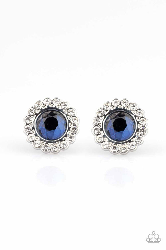 A glittery ring of dainty white rhinestones spins around a blue rhinestone center, creating a sparkling floral frame. Earring attaches to a standard post fitting.