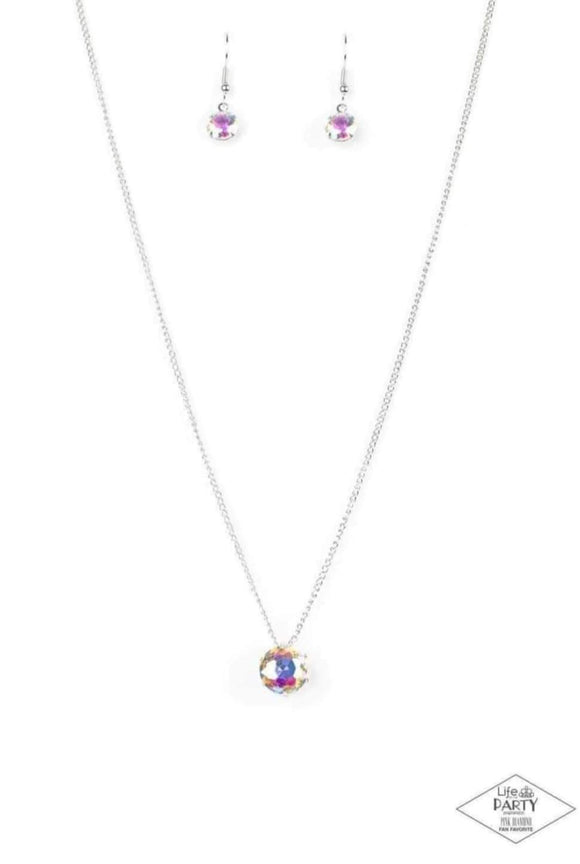 A single iridescent rhinestone sparkles brilliantly at the bottom of a dainty silver chain, creating a stunning solitaire design. Features an adjustable clasp closure.
